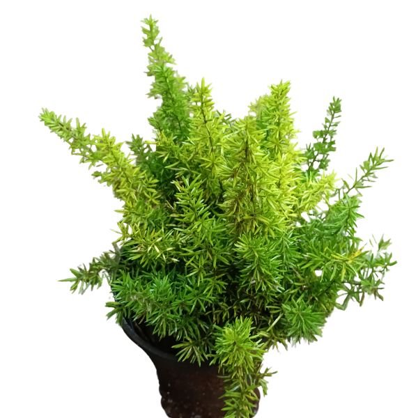 It thrives both indoors and outdoors, adding a lush green texture to gardens, balconies, and tabletops. The plant grows dense, upright plumes and produces tiny white flowers followed by small red berries, making it a beautiful decorative plant.